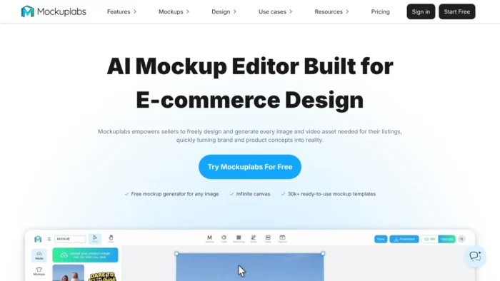 Mockuplabs AI is a free AI-powered mockup generator that transforms any image into professional product mockups for e-commerce, print-on-demand businesses, and marketing campaigns. The platform offers access to over 20,000 customizable templates spanning apparel, accessories, home decor, packaging, print materials, and tech devices, with automatic design fitting that adds realistic shadows and wrinkles. Featuring integrated AI tools including smart color changing, all-over-print design, pattern generation, background removal, and image-to-video conversion, Mockuplabs AI enables users to create high-resolution product visuals in seconds without Photoshop skills.
